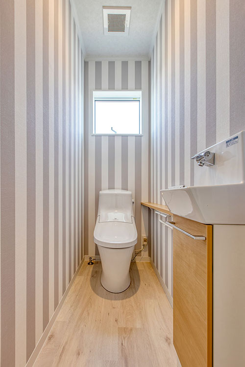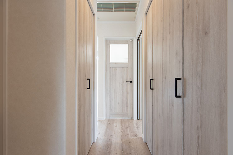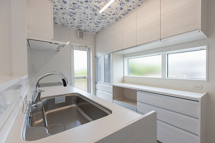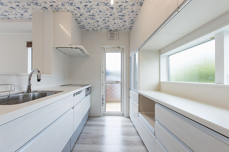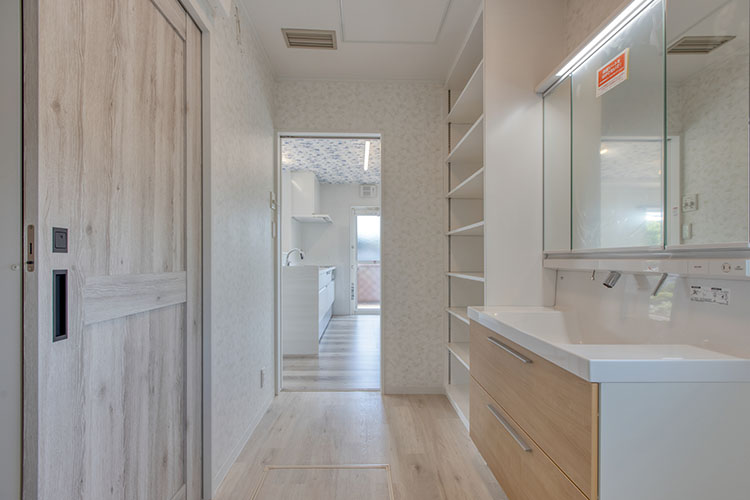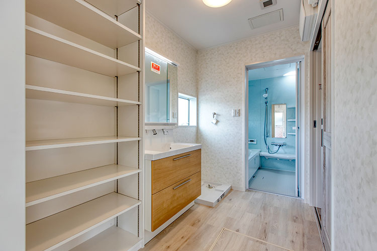 キッチンと洗面脱衣室、お風呂までをストレートに配置。料理、洗濯、お風呂と家事のための動線に無駄がなくスムーズです。また脱衣室には使い道を選ばない大きめの棚を設けました。