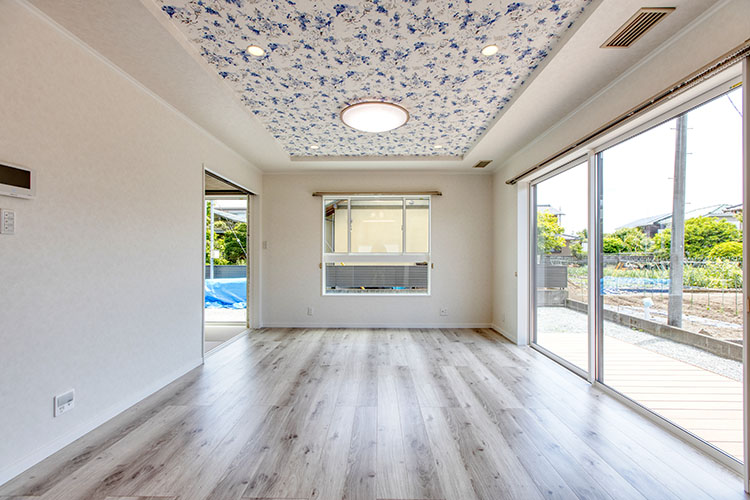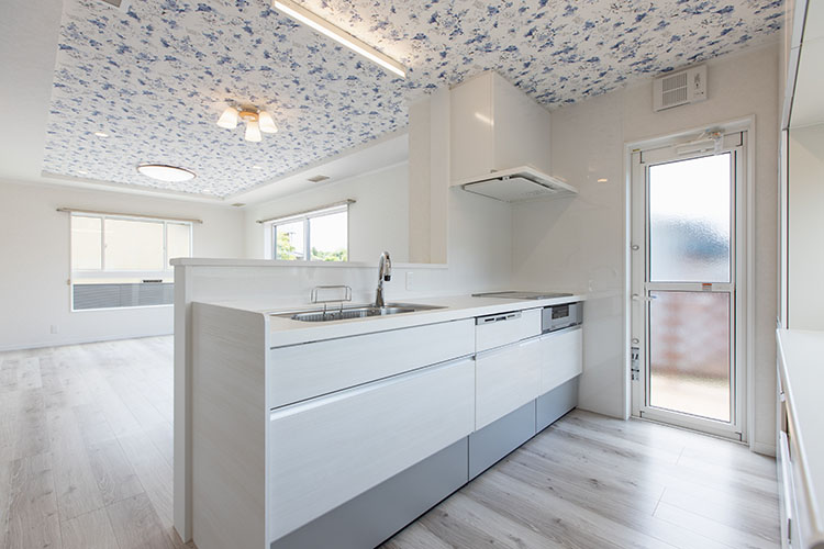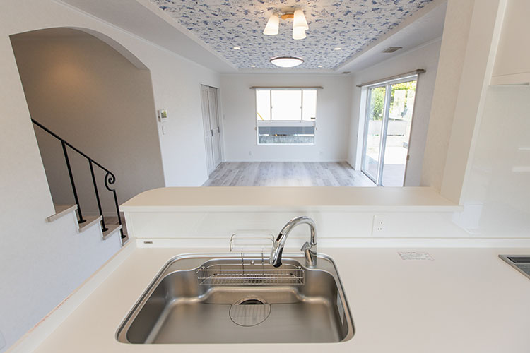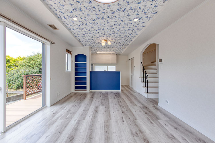 テラスから続く大きな窓が印象的なLDK。対面型キッチンの背面にも窓を取り、自然光を活かした間取りとなりました。奥様の好みでブルーをアクセントカラーに、また上階に続く階段の手摺は造作。くるりとした造形で遊び心をプラスしました。