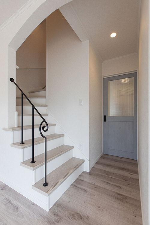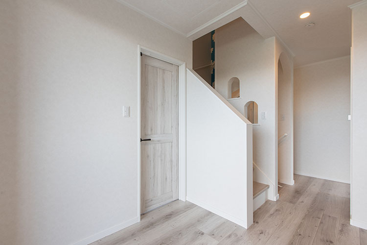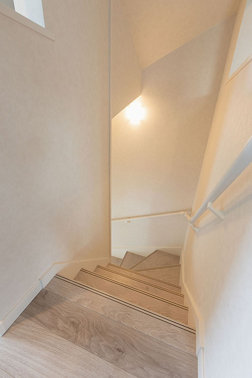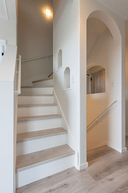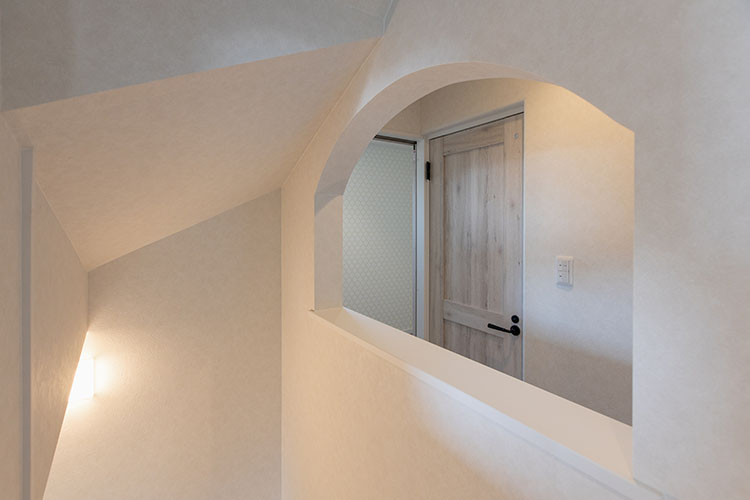 家屋の中央に配置した階段にはアール型の開口部を設けました。明かり取りとしての機能はもちろん、曲線を取り入れることで空間に優しさを演出しました。