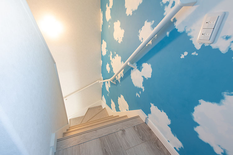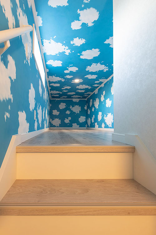 階段を上がったロフト空間はまるで空の上。青空に浮かぶ雲を壁紙で設えました。天井の低いスペースですが、モニターを設置しシアタールームとして有効活用されています。