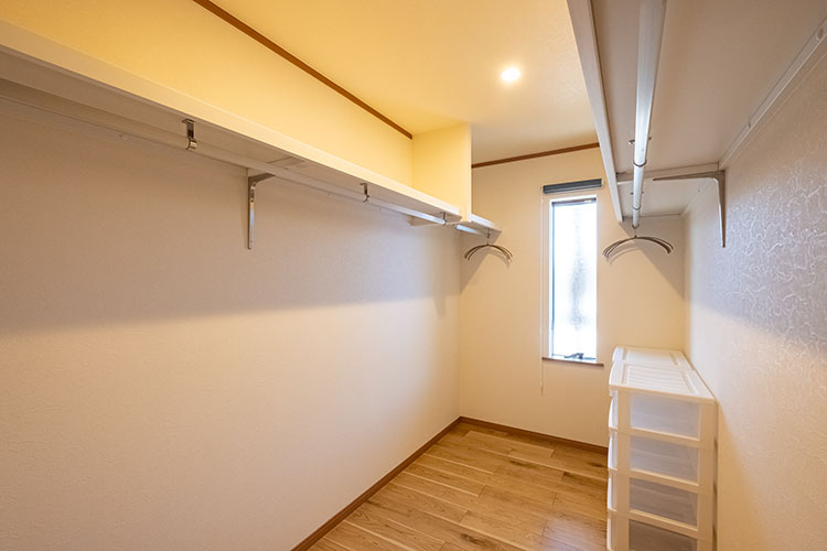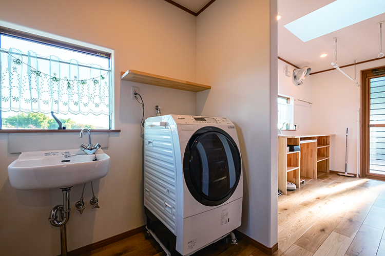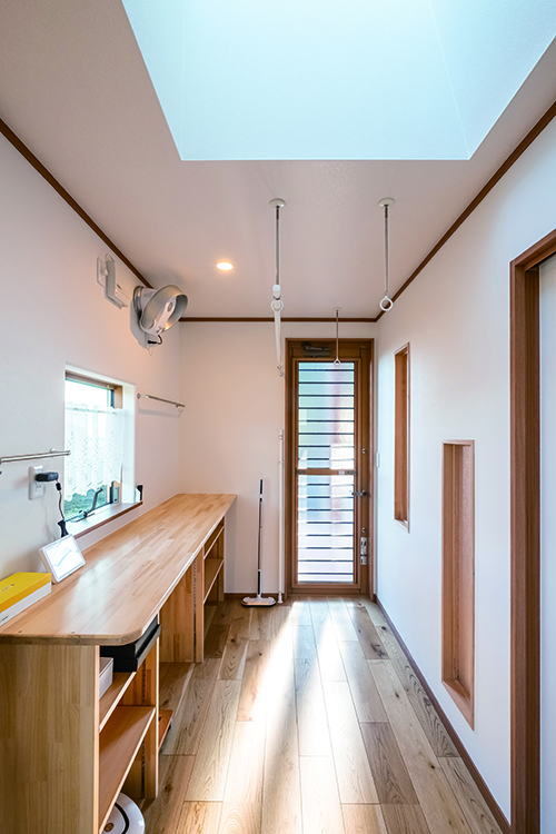 ランドリールームの隣には家事スペースを配置してスムーズな動線。そのまま部屋干し、あるいは外干しもでき、お天気や時間、花粉対策など、さまざまな事情にも対応できます。