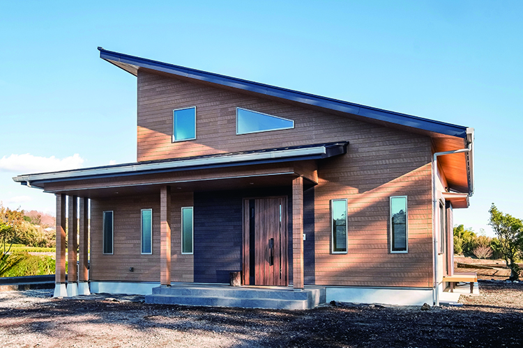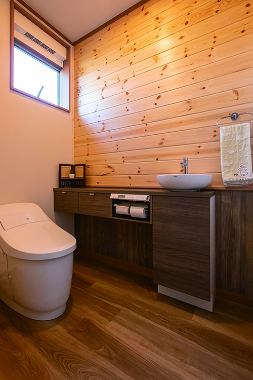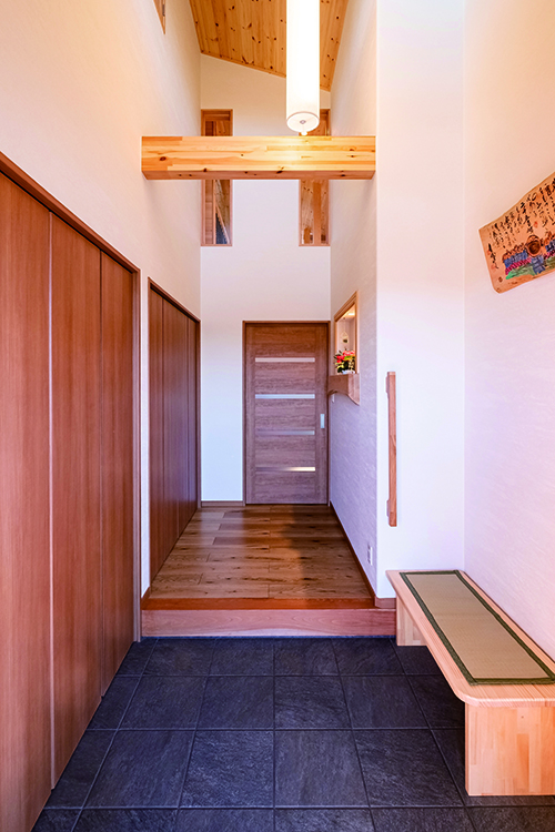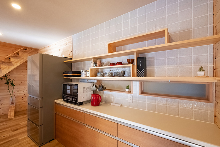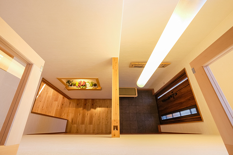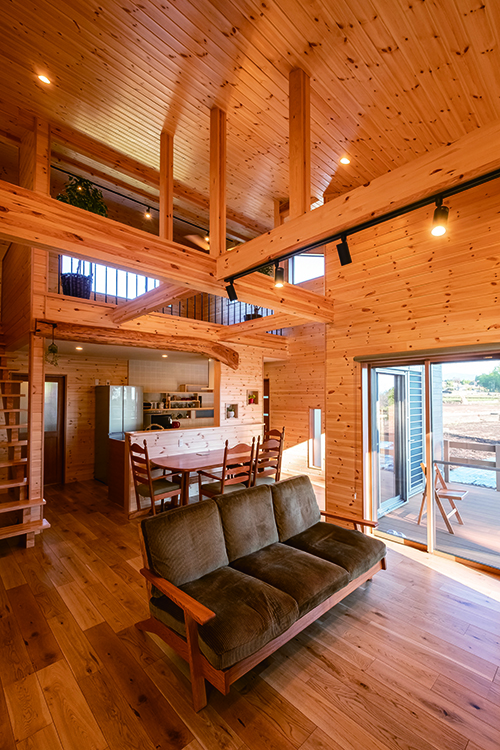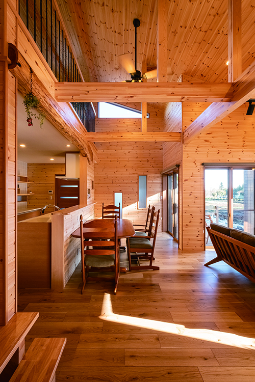 一番の特徴は、吹き抜けのリビングの壁、天井の全面に採用した無垢材。大工泣かせとも言われる技術を駆使して、家族が集まる空間をナチュラルで心地いい家に仕上げました。