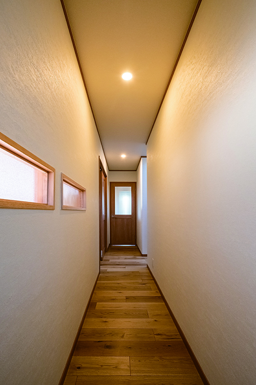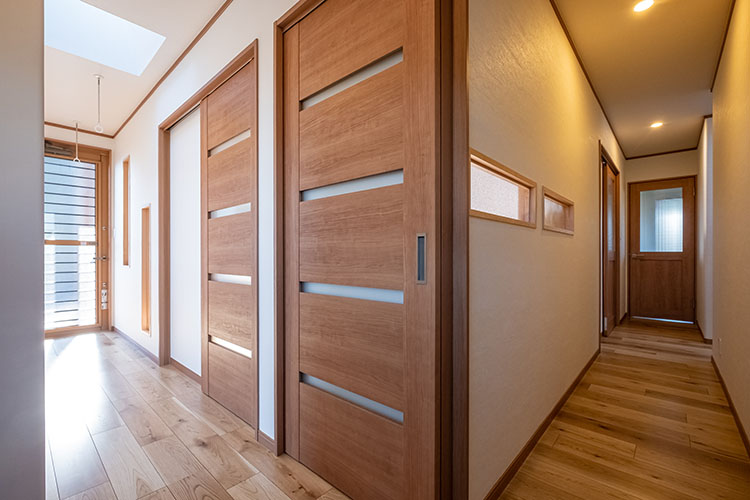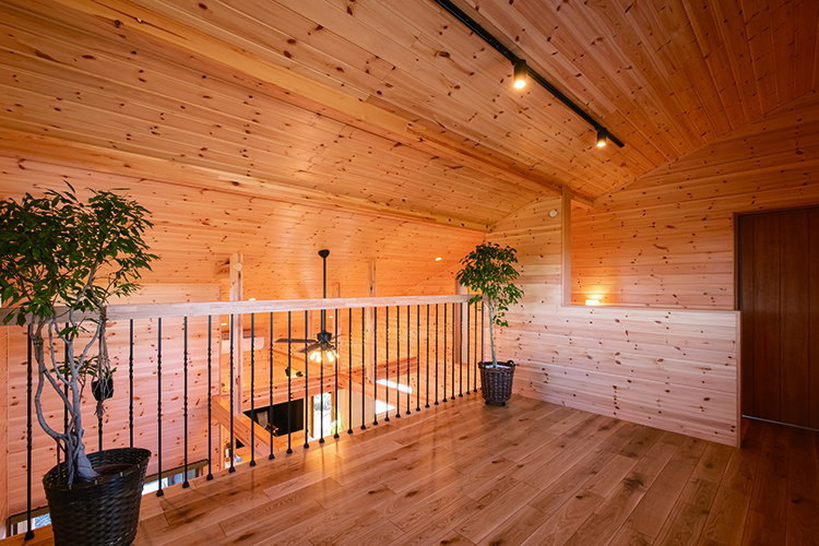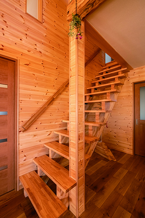 開放感を演出できるスケルトン階段を採用。リビングのインテリアのアクセントとしても有効で、圧迫感も少なく広々とした空間を実現しました。また、壁や天井と同じ無垢材を使い、一体感を出しました。