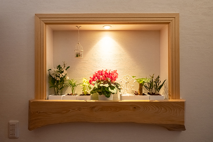 大型テレビの設置が決まっていたため、内装に合わせてテレビ台を。また、キッチンの棚も使い勝手を考慮して造作。さらに、玄関ホールにもちょっとしたインテリアが置けるスペースを設けるなど、住まいを一つの空間としてイメージを統一させ、洗練された雰囲気を演出しました。