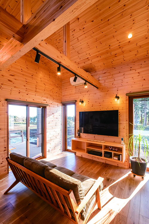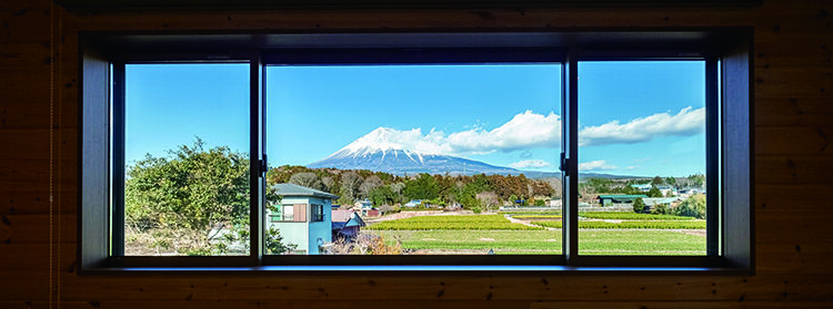 当初はクロス張りか塗り壁というご希望でしたが、別荘感覚の暮らしをというご要望もあり山小屋風に。山側で富士山が美しく見える立地を最大限に生かしました。