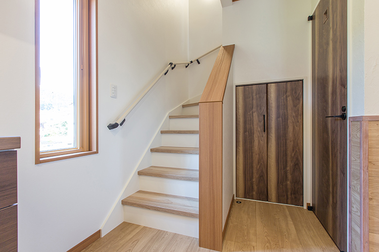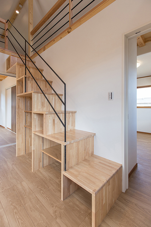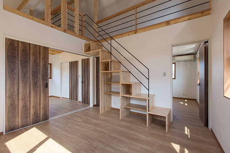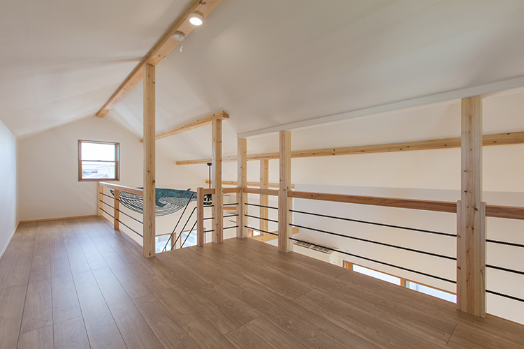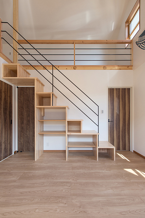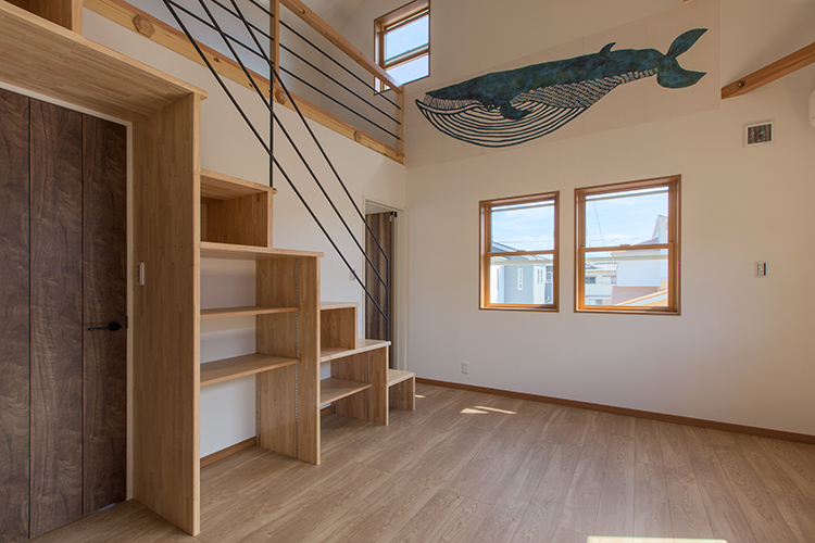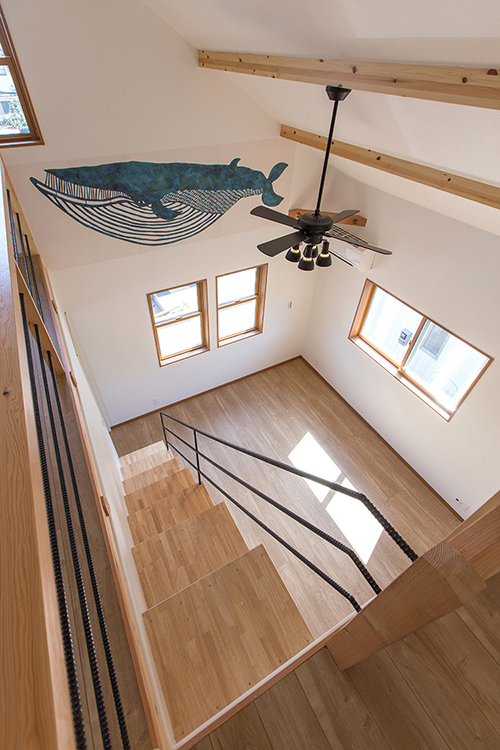 家族のシンボルとなる鯨のクロスはリクエストに沿って。吹き抜けの高い壁面のアクセントとなりました。ロフトに上がる階段は、収納もできインテリアにも。造作手摺のアプローチで上階部分との一体感を演出しました。