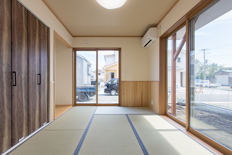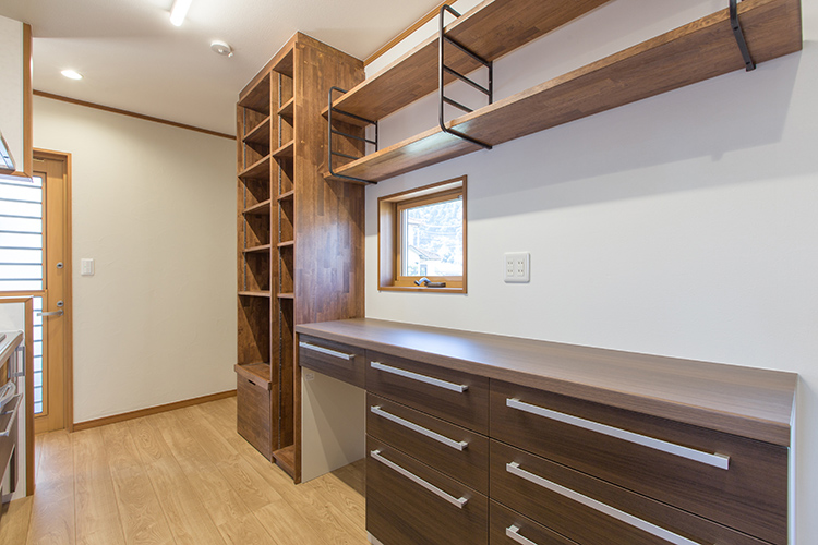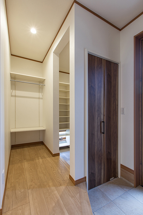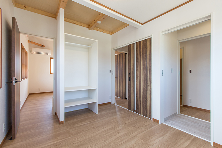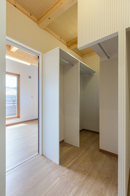 各居室にはオープン型のクロゼットを設置。間仕切り戸やドアを効果的に使うことで、風通しよく、また、人の行き来もフレキシブルにできるよう設計しました。
