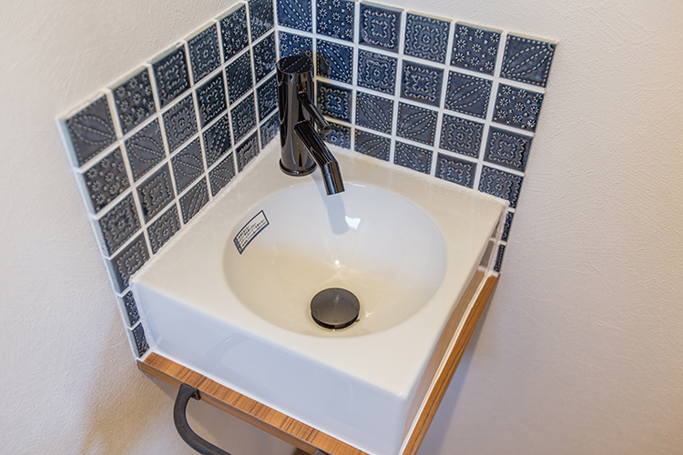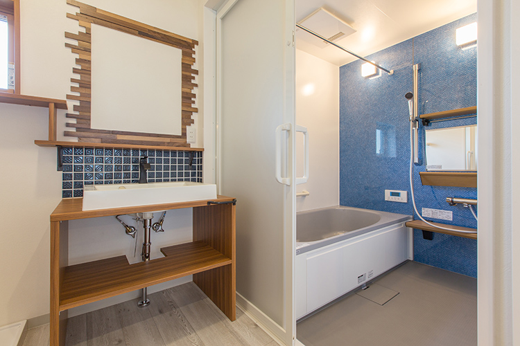 洗面や手洗いには、柄合わせも楽しいデザインタイルをセレクト。清潔感とおしゃれな雰囲気を醸します。バスルームにも似た配色を選び、1日の疲れを癒すスペースとなりました。