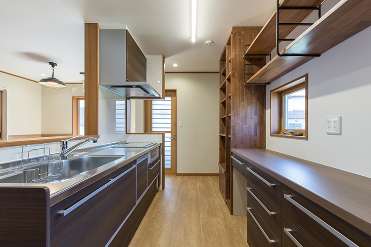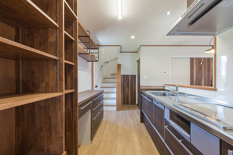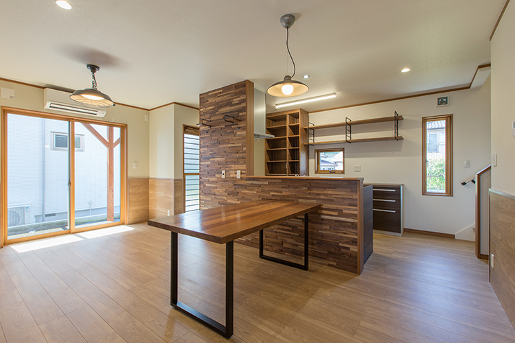 アイランド型キッチンを家族の動線の中央に据え、それぞれの場所から自在に回遊できるようにデザイン。また、壁や天井のビンテージ系のテイストに合わせて、テーブルや棚も造作して、シックにまとめました。
