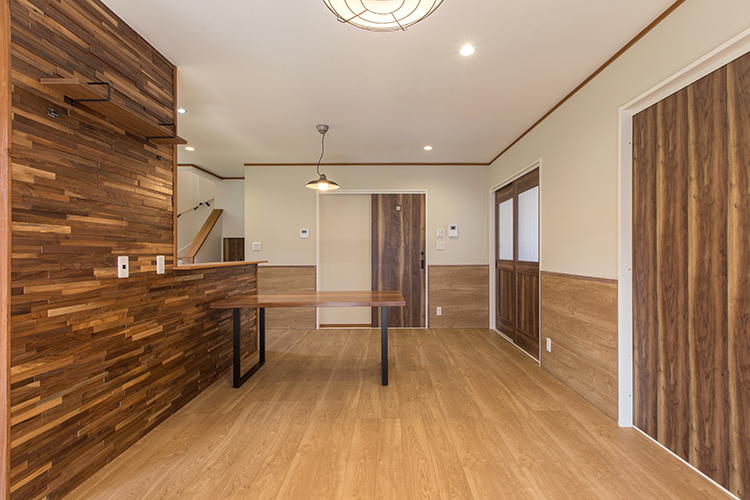 5年前に一度検討されたお客様から、新築で家を建てたいということで、ご連絡をいただきました。女性中心の二世帯住宅をとのこと。リクエストは鯨のクロスを飾りたい、そして、同居される娘様のお好みが“ビンテージ系の黒や茶色”ということのみです。