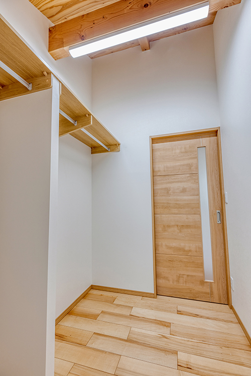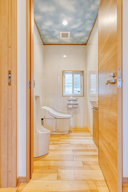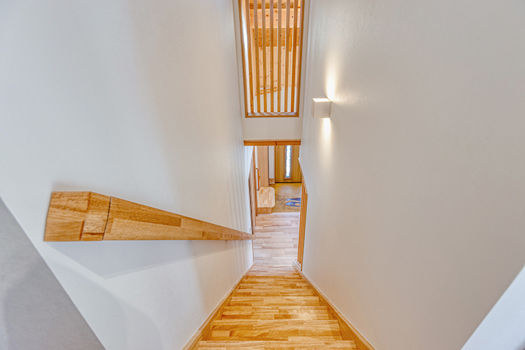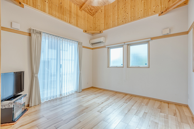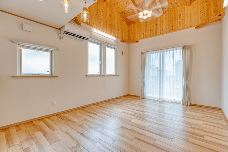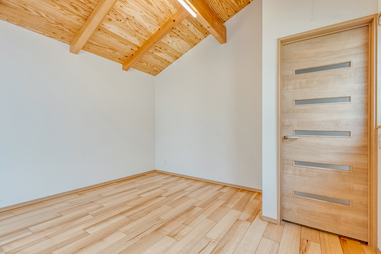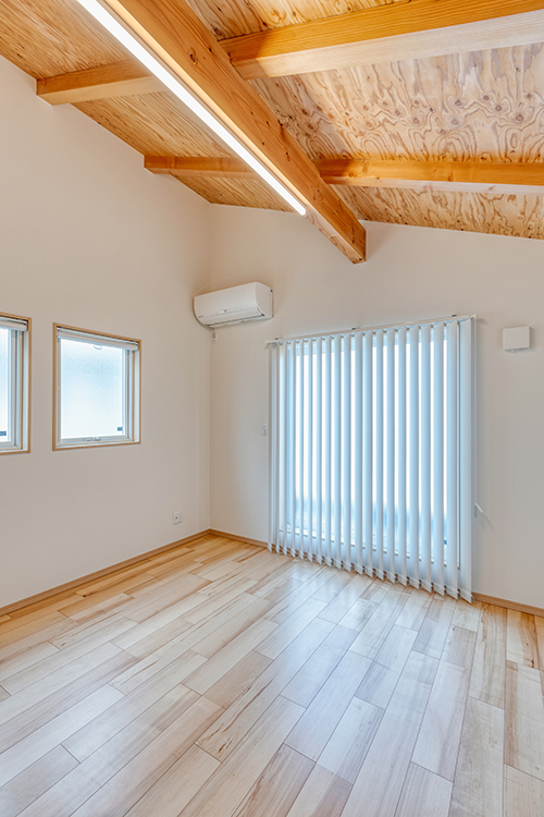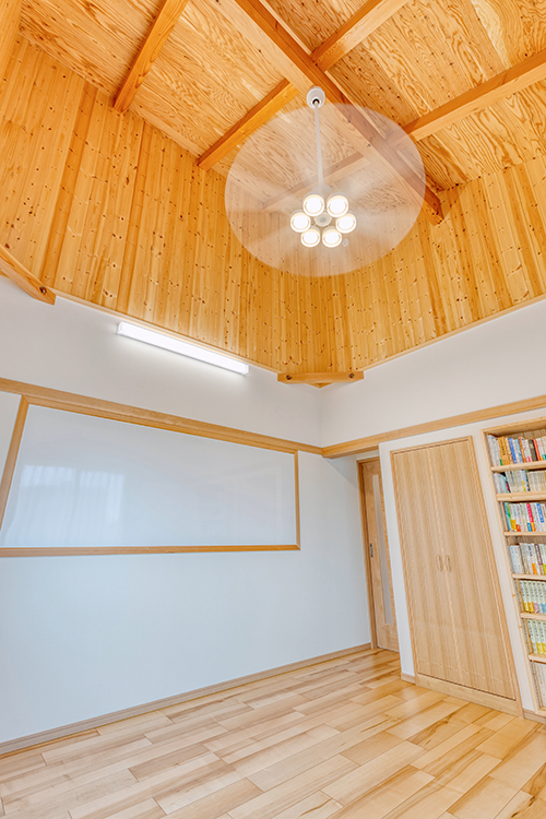 各居室も勾配天井や吹き抜け高天井などの採用で、山小屋風に。木の温もりを感じる心地よさと縦の空間の広がりが魅力。人を呼ぶにふさわしい空間になりました。