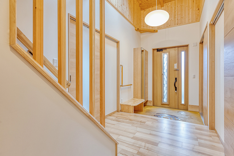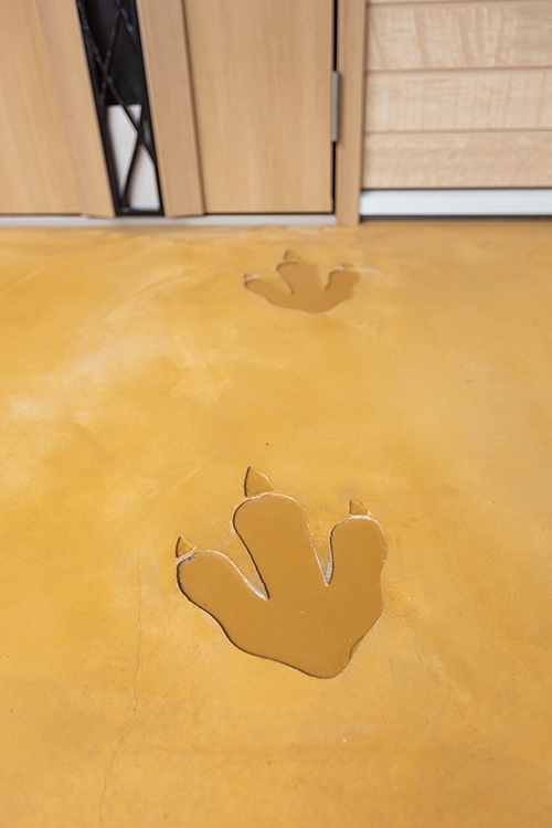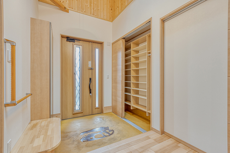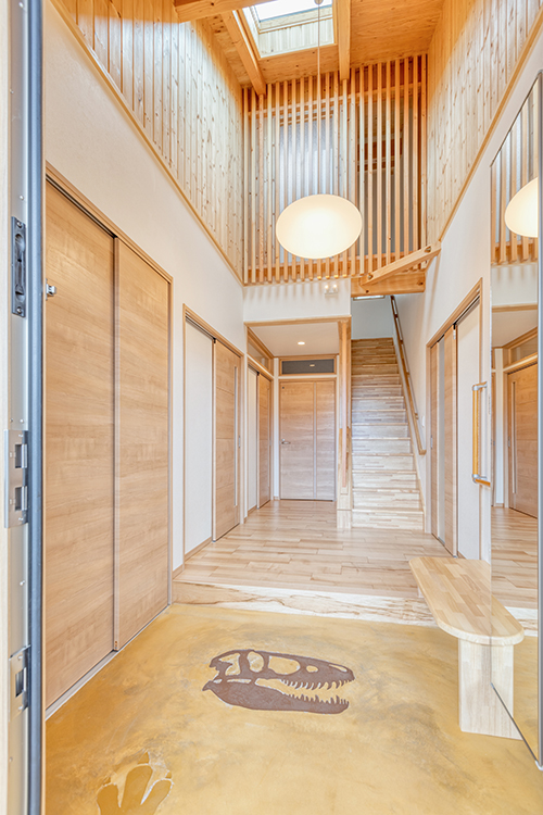 吹き抜けの天窓からは、自然光がたっぷり。明るい玄関の三和土には、ご主人の趣味の恐竜モチーフを施し、お客様を迎えるシンボルとなりました。同モチーフはリビングのボルト隠しなどにも使用。探す楽しさも演出しました。