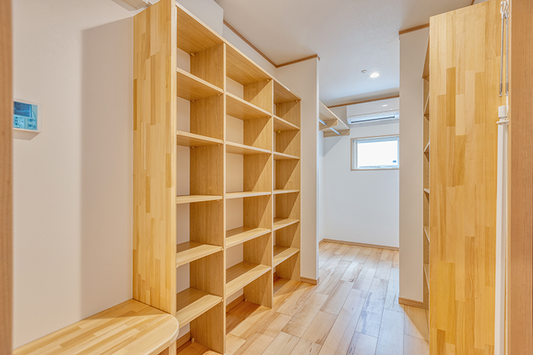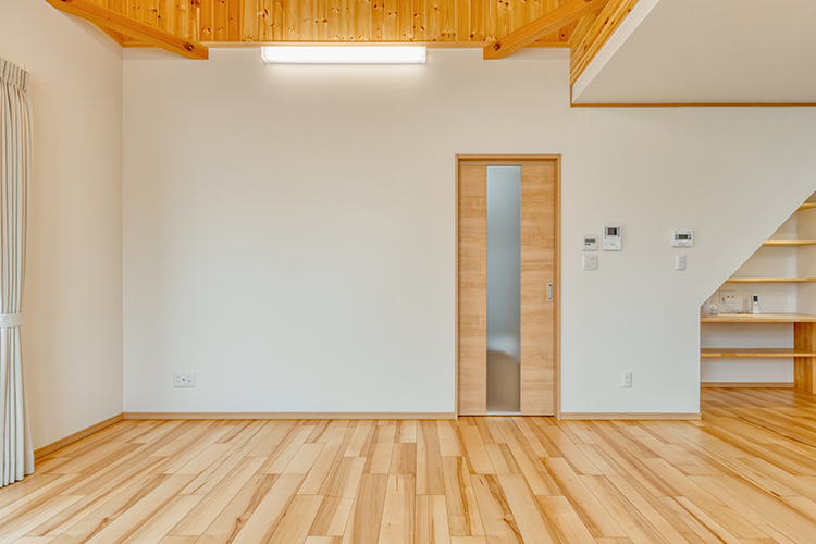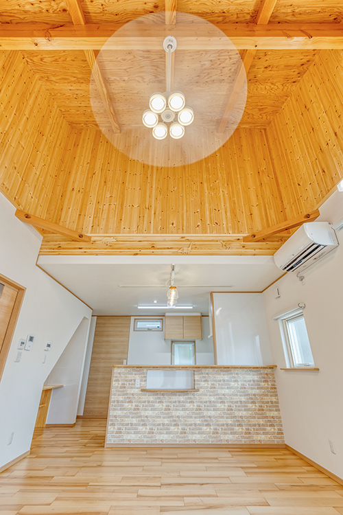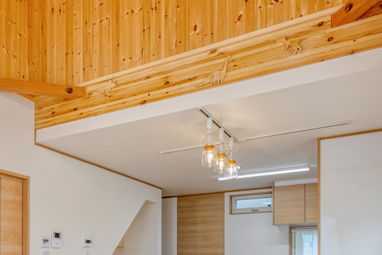 新築を建てるにあたって、一番のご希望が山小屋風の開放感のあるLDKでした。キッチンの天井や壁は標準の高さで実用を重視。リビングスペースは垂木もわかる見せ天井にし、木材の質感を生かしました。