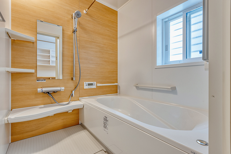 洗面や手洗いには、柄合わせも楽しいデザインタイルをセレクト。清潔感とおしゃれな雰囲気を醸します。バスルームにも似た配色を選び、1日の疲れを癒すスペースとなりました。